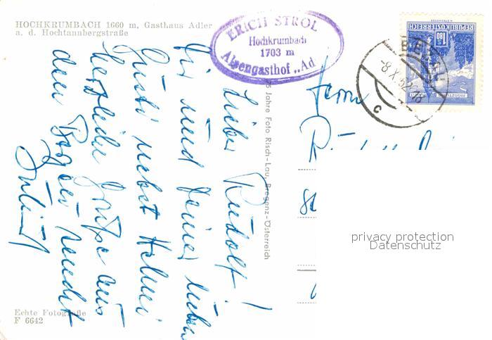 72733160 alte Postkarte Hochkrumbach Gasthaus Adler an der Hochtannbergstrasse Alpen postalisch gelaufen Erhaltung siehe scans [FriedD77] KatCode: 11390341080239