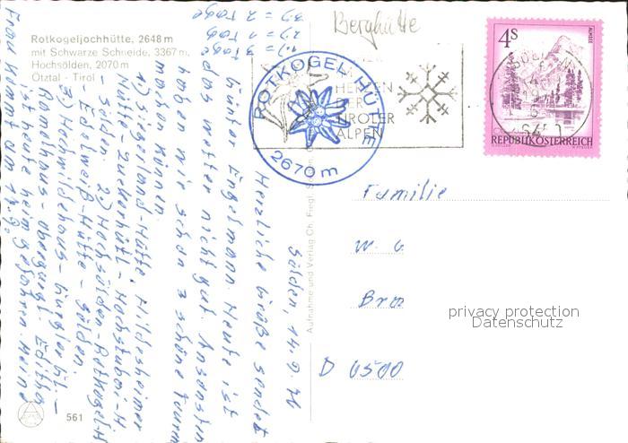 11931956 alte Postkarte Hochsoelden Rotkogeljochhuette mit Schwarze Schneide postalisch gelaufen Erhaltung siehe scans KatCode: 11390334070220