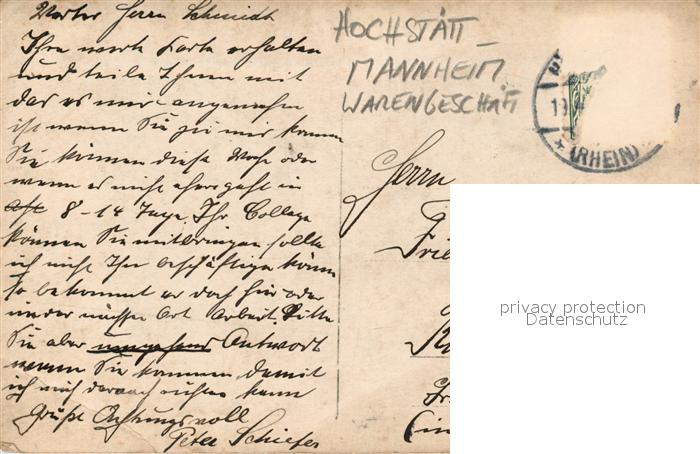 33547111 alte Postkarte Hochstaett Mannheim Warengeschaeft postalisch gelaufen Erhaltung siehe scans [KathaD81] KatCode: 11110008222000