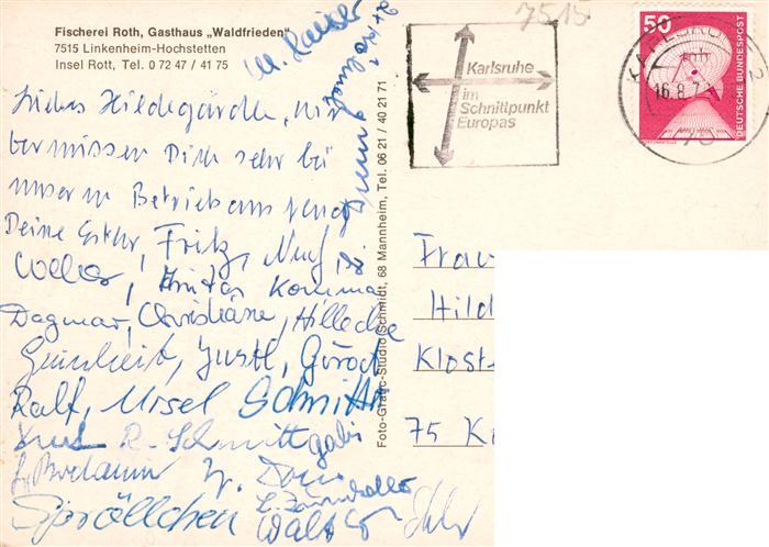 73938219 alte Postkarte Hochstetten Linkenheim-Hochstetten Fischerei Roth Gasthaus Waldfrieden Gastraeume postalisch gelaufen Erhaltung siehe scans [WerneD78] KatCode: 11110008215105