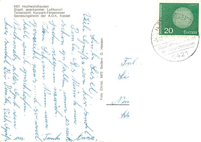 73896768 alte Postkarte Hochwaldhausen Grebenhain Kurpark Felsenmeer Genesungsheim der AOK Kassel postalisch gelaufen Erhaltung siehe scans [WerneD78] KatCode: 11110006535007