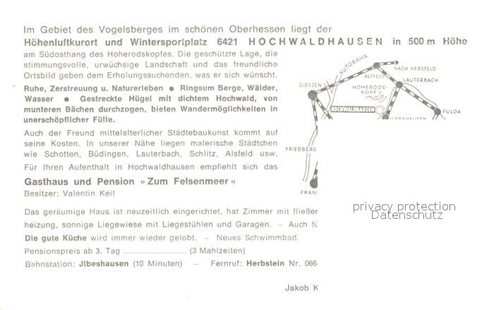73542788 Hochwaldhausen Ilbeshausen Panorama Schwimmbad Schwarzbachtal Gasthaus Pension Zum Felsenmeer Teufelsmuehle Taufstein Aussichtsturm postalisch nicht gelaufen Werbekarte (keine Postkarte) Erhaltung siehe scans [FriedD77] KatCode: 11110006535007