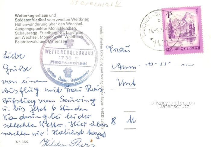 73049749 alte Postkarte Hochwechsel Mariensee Wetterkogelhaus Soldatengedenkstaette postalisch gelaufen Erhaltung siehe scans [WerneD78] KatCode: 11390