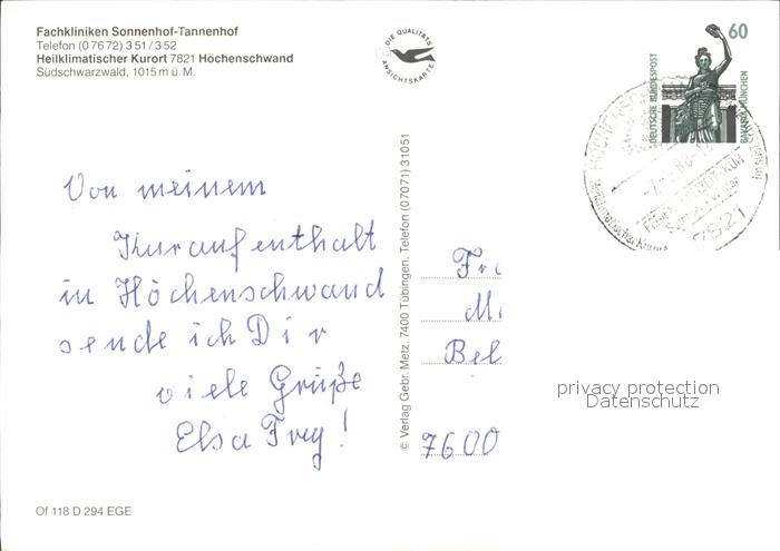 72558763 alte Postkarte Hoechenschwand Schwarzwald BW Fachkliniken Sonnenhof Tannenhof Kurort postalisch gelaufen Erhaltung siehe scans [AntonD74] KatCode: 11110008337051