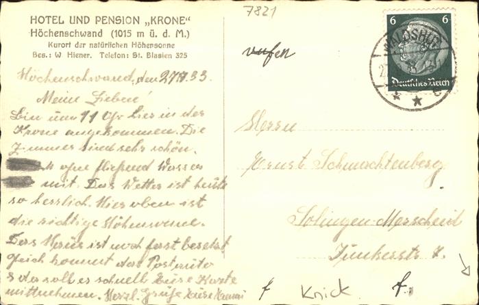 41311461 Hoechenschwand Schwarzwald BW Hotel Krone postalisch gelaufen Alte Ansichtskarte Postkarte alte Postkarte hz_C Katcode 11110008337051