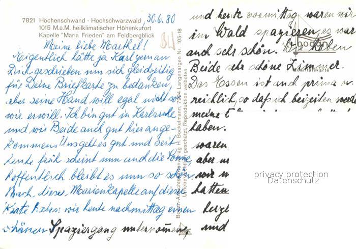 72668443 Hoechenschwand Schwarzwald BW Kapelle Maria Frieden postalisch nicht gelaufen Erhaltung siehe scans [AndreD76] KatCode: 11110008337051