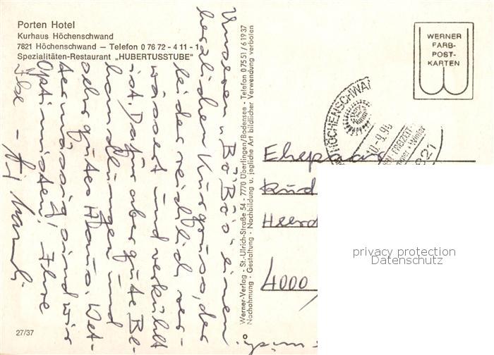 73845143 Hoechenschwand Schwarzwald BW Porten Hotel postalisch nicht gelaufen Erhaltung siehe scans [WerneD78] Wern Katcode 11110008337051