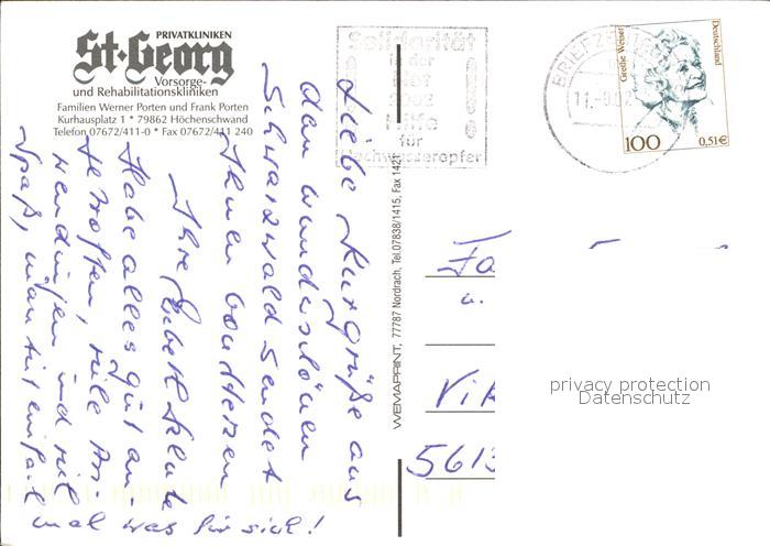 72073332 alte Postkarte Hoechenschwand Schwarzwald BW St Georg Privatkliniken postalisch gelaufen Erhaltung siehe scans KatCode: 11110008337051