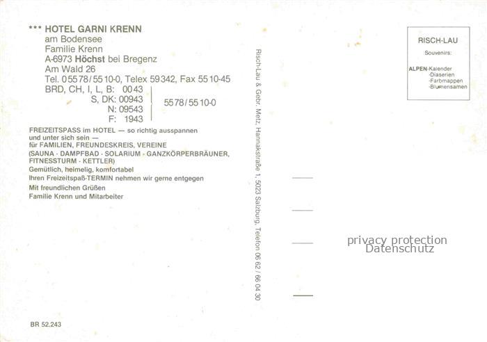 74141842 Hoechst Bodensee Vorarlberg AT Hotel Garni Krenn Wellness postalisch nicht gelaufen Erhaltung siehe scans [FriedD77] KatCode: 11390342080217