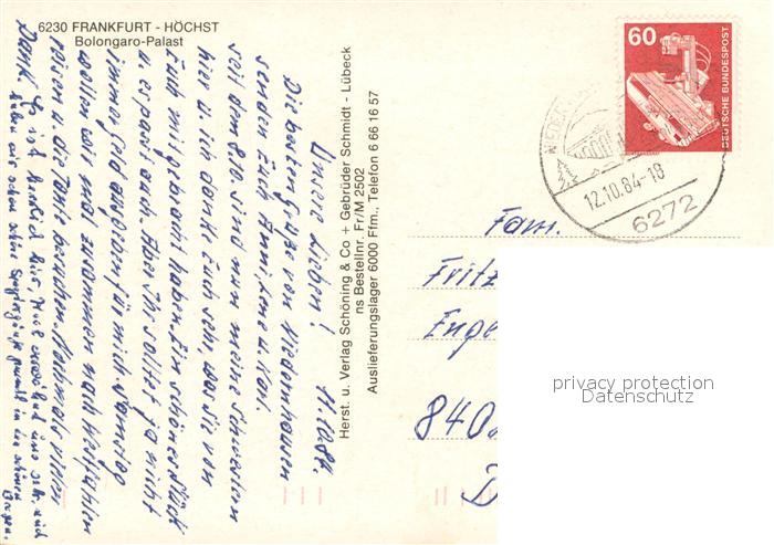 73746008 alte Postkarte Hoechst Main Bolongaro Palast postalisch gelaufen Erhaltung siehe scans [WerneD78] KatCode: 11110006412000