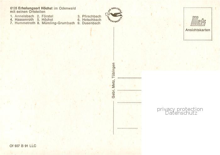 73869495 Hoechst Odenwald Annelsbach Forstel Pfirschbach Hassenroth Ev Jugendzentrum Hetschbach Hummelroth Muemling Crumbach Dusenbach postalisch nicht gelaufen Erhaltung siehe scans [WerneD78] KatCode: 11110006437009