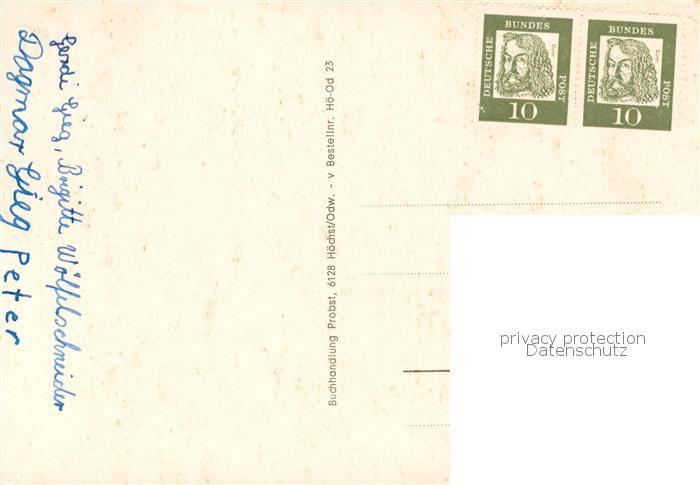 73869494 alte Postkarte Hoechst Odenwald Bergblick partie an der Muemling Burg Breuberg Rathausbrunnen Schwimmbad Galgenbergblick Klosterhof Burghof postalisch gelaufen Erhaltung siehe scans [WerneD78] KatCode: 11110006437009