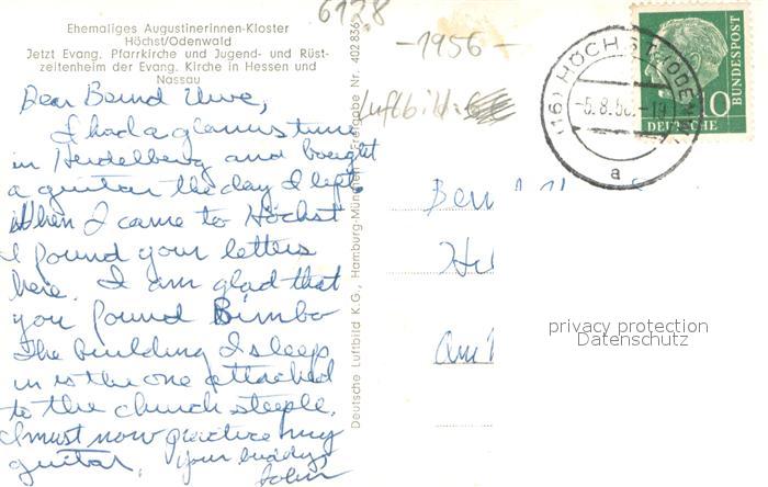 73749323 alte Postkarte Hoechst Odenwald Ehem Augustinerinnen Kloster Fliegeraufnahme postalisch gelaufen Erhaltung siehe scans [WerneD78] KatCode: 11110006437009