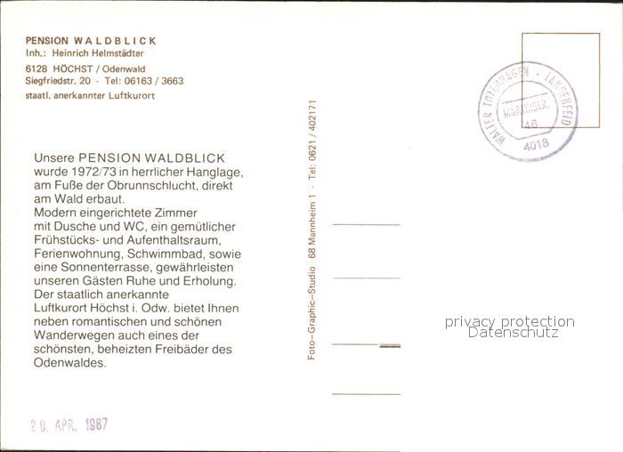 72156552 Hoechst Odenwald Pension Waldblick postalisch nicht gelaufen Erhaltung siehe scans KatCode: 11110006437009