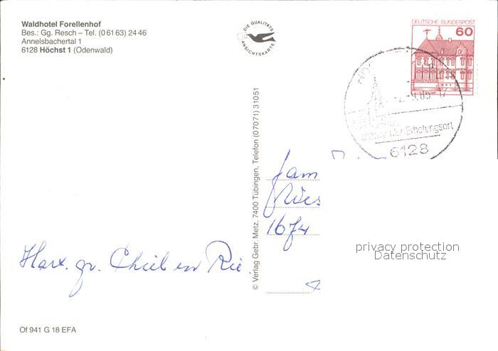 72470048 alte Postkarte Hoechst Odenwald Waldhotel Forellenhof postalisch gelaufen Erhaltung siehe scans KatCode: 11110006437009