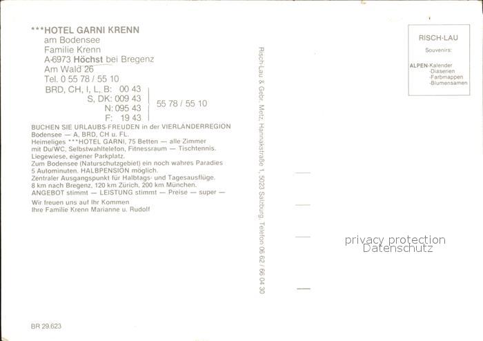 72492498 Hoechst Vorarlberg Hotel Garni Krenn postalisch nicht gelaufen Werbekarte (keine Postkarte) Erhaltung siehe scans KatCode: 11390342080217