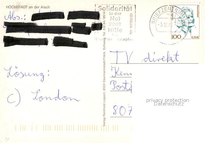 73238701 alte Postkarte Hoechstadt Aisch postalisch gelaufen Erhaltung siehe scans [NatalD47] KatCode: 11110009572135