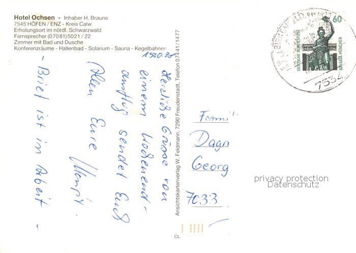 73790237 alte Postkarte Hoefen Enz Hotel Ochsen Restaurant Hallenbad postalisch gelaufen Erhaltung siehe scans [FriedD77] KatCode: 11110008235035