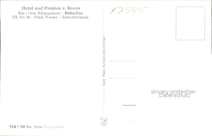 41775305 Hoefen Enz Hotel Pension z. Sonne postalisch nicht gelaufen Erhaltung siehe scans KatCode: 11110008235035