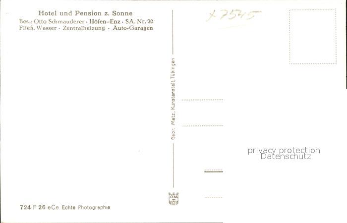 41815520 Hoefen Enz Hotel Pension zur Sonne Luftkurort Schwarzwald postalisch nicht gelaufen Erhaltung siehe scans Alte Ansichtskarte Postkarte hz_F Katcode 11110008235035