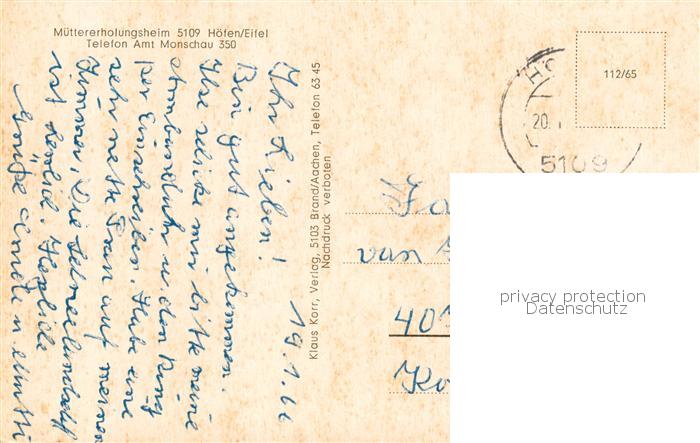 73838864 alte Postkarte Hoefen Monschau Muettererholungsheim postalisch gelaufen Erhaltung siehe scans [WerneD78] KatCode: 11110005354020