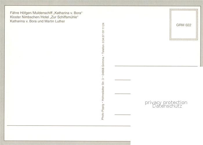 73732982 Hoefgen Grimma Faehre Muldenschiff Katharin von Bora Luther Portrait Kloster Nimbschen Hotel Zur Schiffsmuehle postalisch nicht gelaufen Erhaltung siehe scans [FriedD77] KatCode: 11110014383120