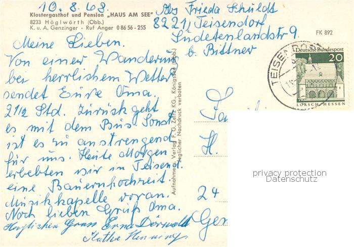 73766940 alte Postkarte Hoeglwoerth Klostergasthof Haus am See Gaststube Panorama postalisch gelaufen Erhaltung siehe scans [FriedD77] KatCode: 11110009172112
