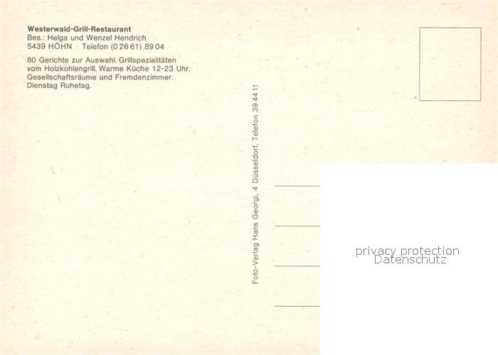 73070179 Hoehn Westerwald Grill Restaurant postalisch nicht gelaufen Erhaltung siehe scans [FriedD77] KatCode: 11110007143242
