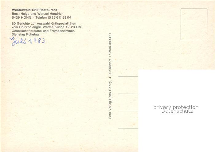 73070178 Hoehn Westerwald Grill Restaurant postalisch nicht gelaufen Erhaltung siehe scans [FriedD77] KatCode: 11110007143242