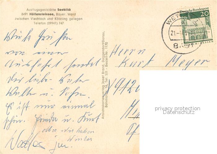 73720686 alte Postkarte Hoellensteinsee Ausflugsgaststaette Seeblick postalisch gelaufen Erhaltung siehe scans [FriedD77] KatCode: 11110009276144