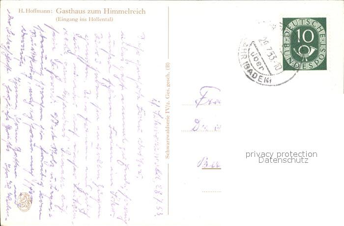 72530077 alte Postkarte Hoellental Schwarzwald Gasthaus zum Himmelreich postalisch gelaufen Erhaltung siehe scans KatCode: 11110008315020
