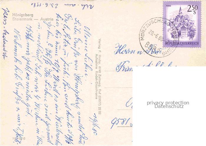 74156619 alte Postkarte Hoenigsberg Muerzzuschlag Steiermark AT Hoenigsberg Talblick Felder Wohnbloecke Berglandschaft Muerzzuschlag Steiermark postalisch gelaufen Fliegeraufnahme Erhaltung siehe scans [Karloger] KatCode: 11390223061311