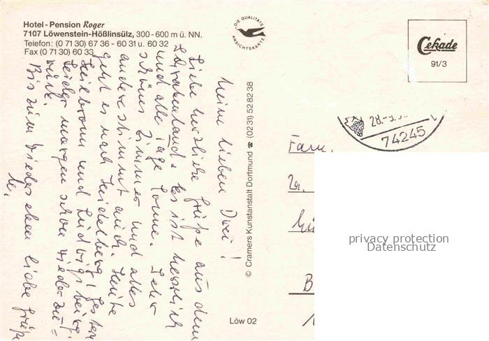 74023616 alte Postkarte Hoesslinsuelz Hotel Pension Roger Restaurant Rezeption Naturpark Schwaebisch-Fraenkischer Wald postalisch gelaufen Erhaltung siehe scans [FriedD77] KatCode: 11110008125059