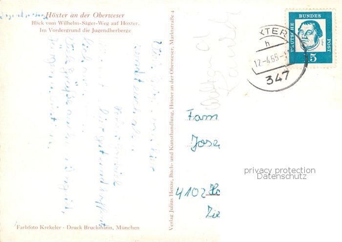 73813990 alte Postkarte Hoexter Weser Blick vom Wilhelm Saeger Weg mit Jugendherberge postalisch gelaufen Erhaltung siehe scans [FriedD77] KatCode: 11110005762020