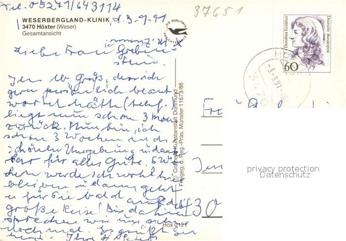 73540041 alte Postkarte Hoexter Weser Fliegeraufnahme mit Weserbergland Klinik postalisch gelaufen Erhaltung siehe scans [WerneD78] KatCode: 11110005762020