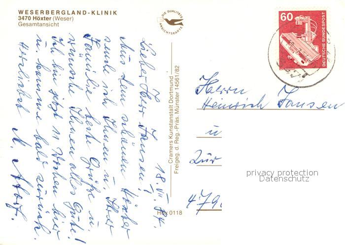 73119854 alte Postkarte Hoexter Weser Fliegeraufnahme Weserbergland-Klinik postalisch gelaufen Erhaltung siehe scans [LiesaD40] KatCode: 11110005762020