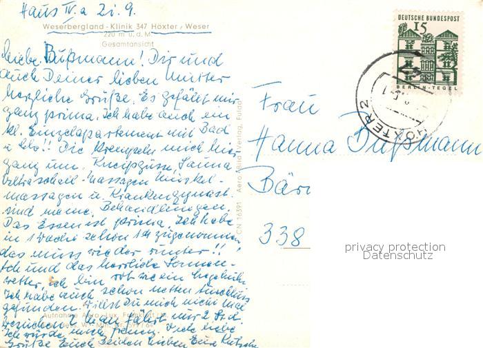 73080646 alte Postkarte Hoexter Weser Fliegeraufnahme Weserbergland Klinik postalisch gelaufen Erhaltung siehe scans [KathaD81] KatCode: 11110005762020