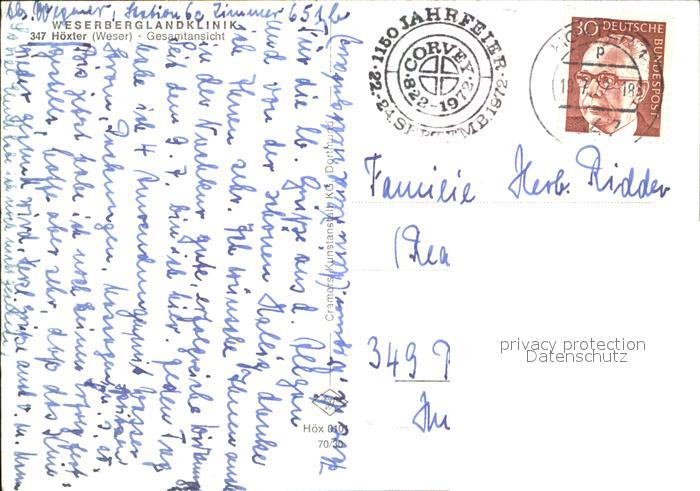 72507890 alte Postkarte Hoexter Weser Fliegeraufnahme Weserberglandklinik postalisch gelaufen Erhaltung siehe scans KatCode: 11110005762020