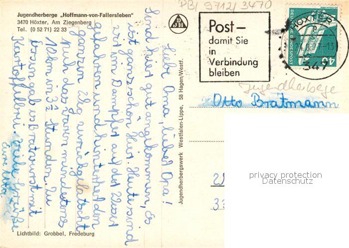 73166565 alte Postkarte Hoexter Weser Jugendherberge Hoffmann von Fallersleben Halle postalisch gelaufen Erhaltung siehe scans [FriedD77] KatCode: 11110005762020