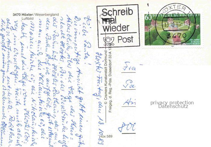 74157649 alte Postkarte Hoexter Weser NRW Hoexter Weserbergland Weser Kirchturm Altstadt Felder Luftbild postalisch gelaufen Fliegeraufnahme Erhaltung siehe scans [Karloger] KatCode: 11110005762020