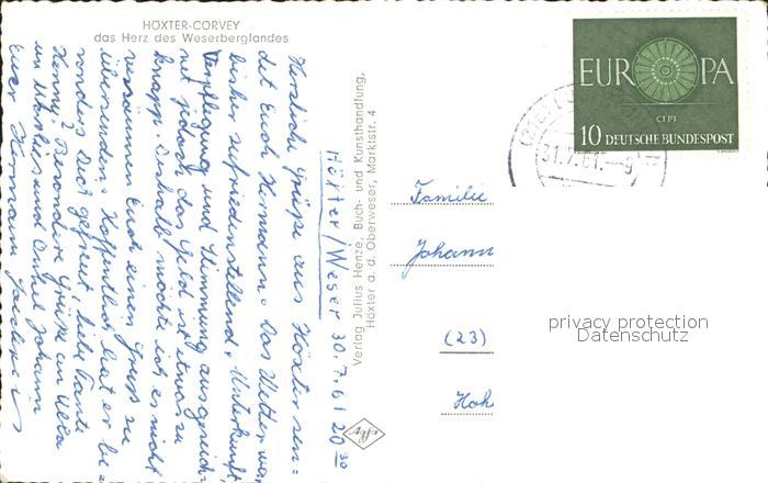 72274958 alte Postkarte Hoexter Weser Rathaus Schloss Corvey Weserbergland- Klinik postalisch gelaufen Erhaltung siehe scans KatCode: 11110005762020
