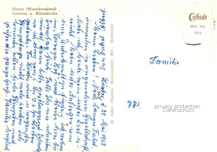 73624391 alte Postkarte Hoexter Weser Rathaus und Kiliankirche postalisch gelaufen Erhaltung siehe scans [FriedD77] KatCode: 11110005762020