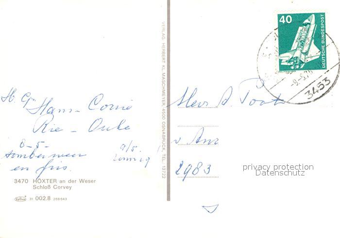 72928574 alte Postkarte Hoexter Weser Schloss Corvey Eingang postalisch gelaufen Erhaltung siehe scans [WerneD78] KatCode: 11110005762020