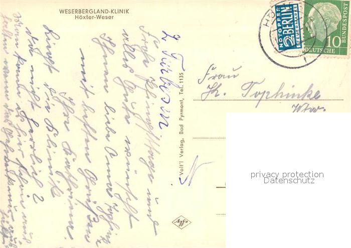 72938535 alte Postkarte Hoexter Weser Weserbergland-Klinik postalisch gelaufen Erhaltung siehe scans [NatalD47] KatCode: 11110005762020