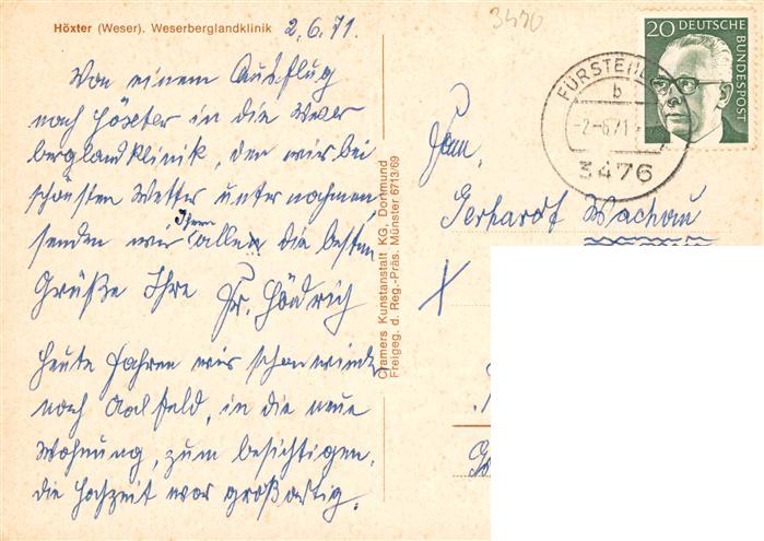 73943995 alte Postkarte Hoexter Weser Weserbergland-Klinik postalisch gelaufen Fliegeraufnahme Erhaltung siehe scans [FriedD77] KatCode: 11110005762020
