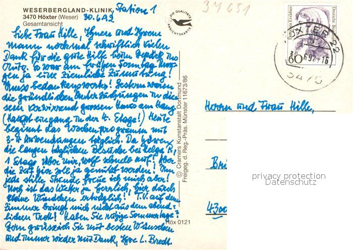 73540096 alte Postkarte Hoexter Weser Weserbergland Klinik Fliegeraufnahme postalisch gelaufen Erhaltung siehe scans [WerneD78] KatCode: 11110005762020