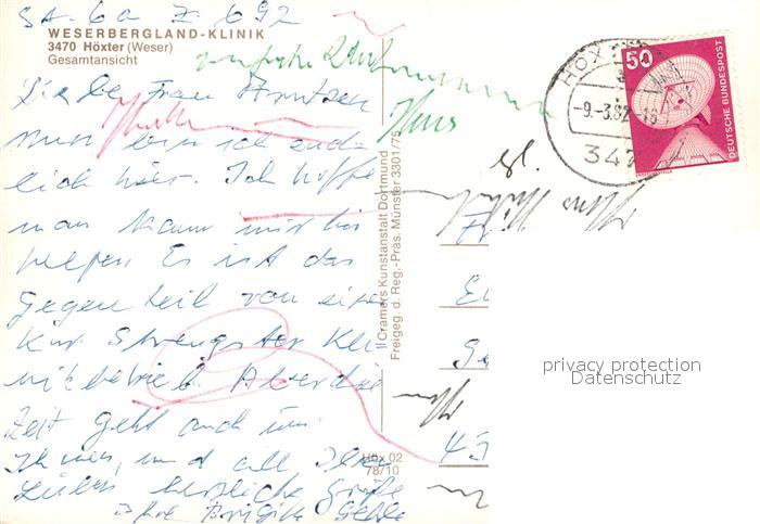 73167184 alte Postkarte Hoexter Weser Weserbergland Klinik Fliegeraufnahme postalisch gelaufen Erhaltung siehe scans [FriedD77] KatCode: 11110005762020