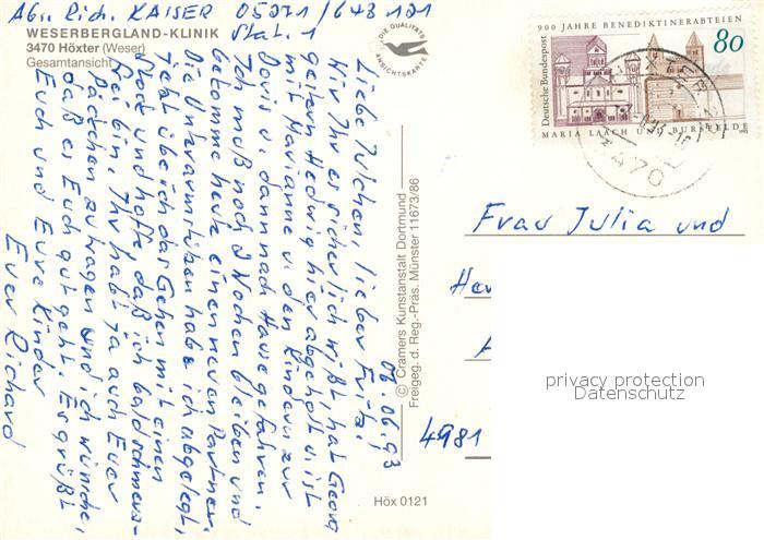 73101550 alte Postkarte Hoexter Weser Weserbergland Klinik Fliegeraufnahme postalisch gelaufen Erhaltung siehe scans [WerneD78] KatCode: 11110005762020