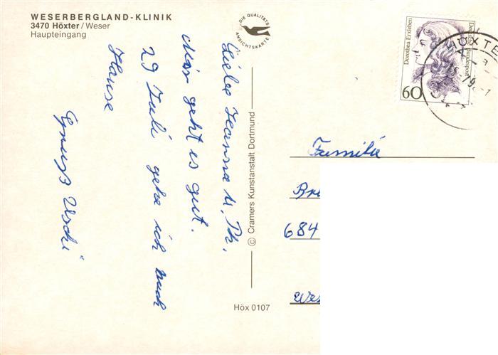73885959 alte Postkarte Hoexter Weser Weserbergland Klinik Haupteingang postalisch gelaufen Erhaltung siehe scans [WerneD78] KatCode: 11110005762020