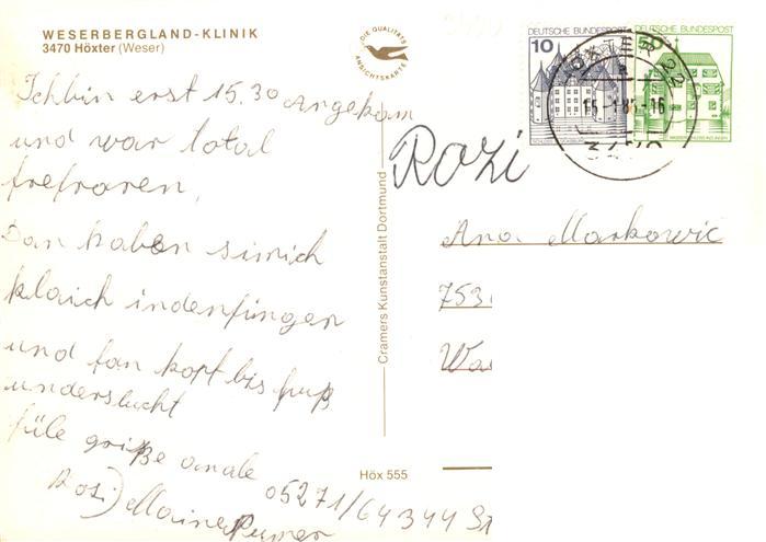 73944003 alte Postkarte Hoexter Weser Weserbergland-Klinik Luftaufnahme Rathaus Freibad Kloster Corvey Fachwerkhaeuser Partie an der Weser Fahrgastschiff postalisch gelaufen Erhaltung siehe scans [FriedD77] KatCode: 11110005762020